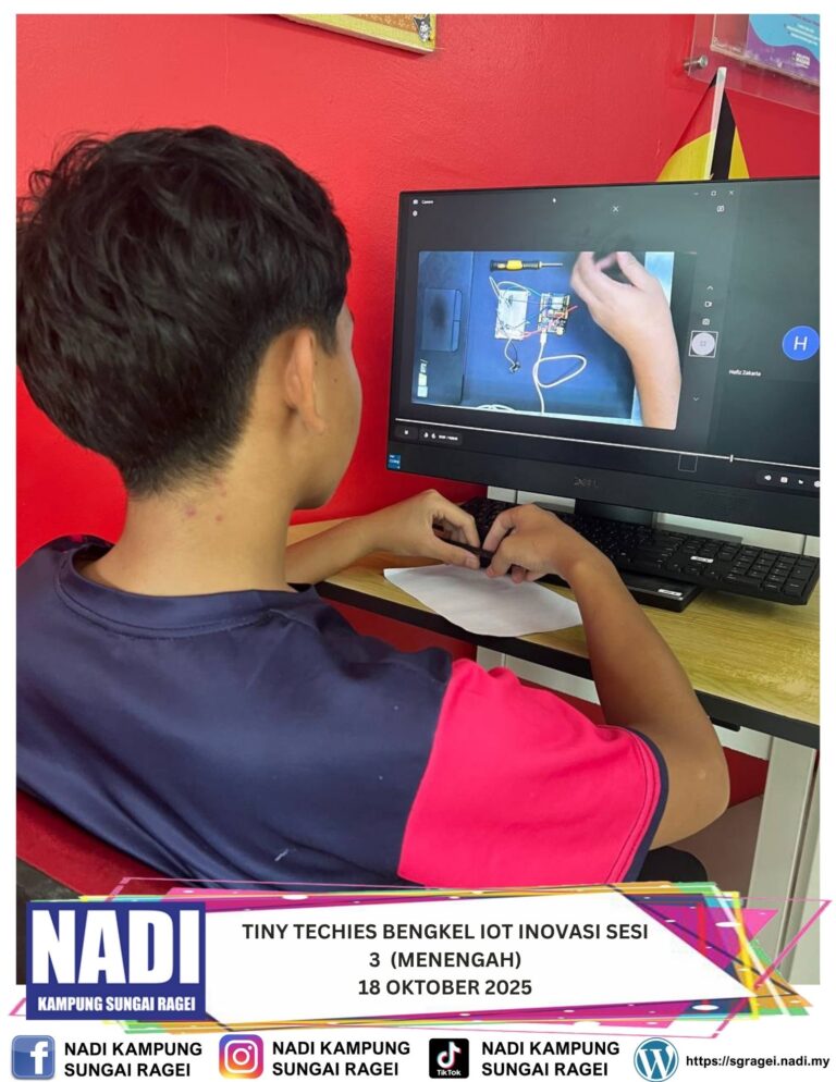 Program Tiny Techies – Bengkel IoT Inovasi Sesi 3 ini disertai oleh pelajar sekolah menengah dan bertujuan memperkenalkan konsep asas Internet of Things (IoT). Sesi ini memberi pendedahan kepada peserta tentang cara menghubungkan peranti pintar, memahami fungsi sensor, serta membina idea inovasi digital yang praktikal dalam kehidupan seharian.